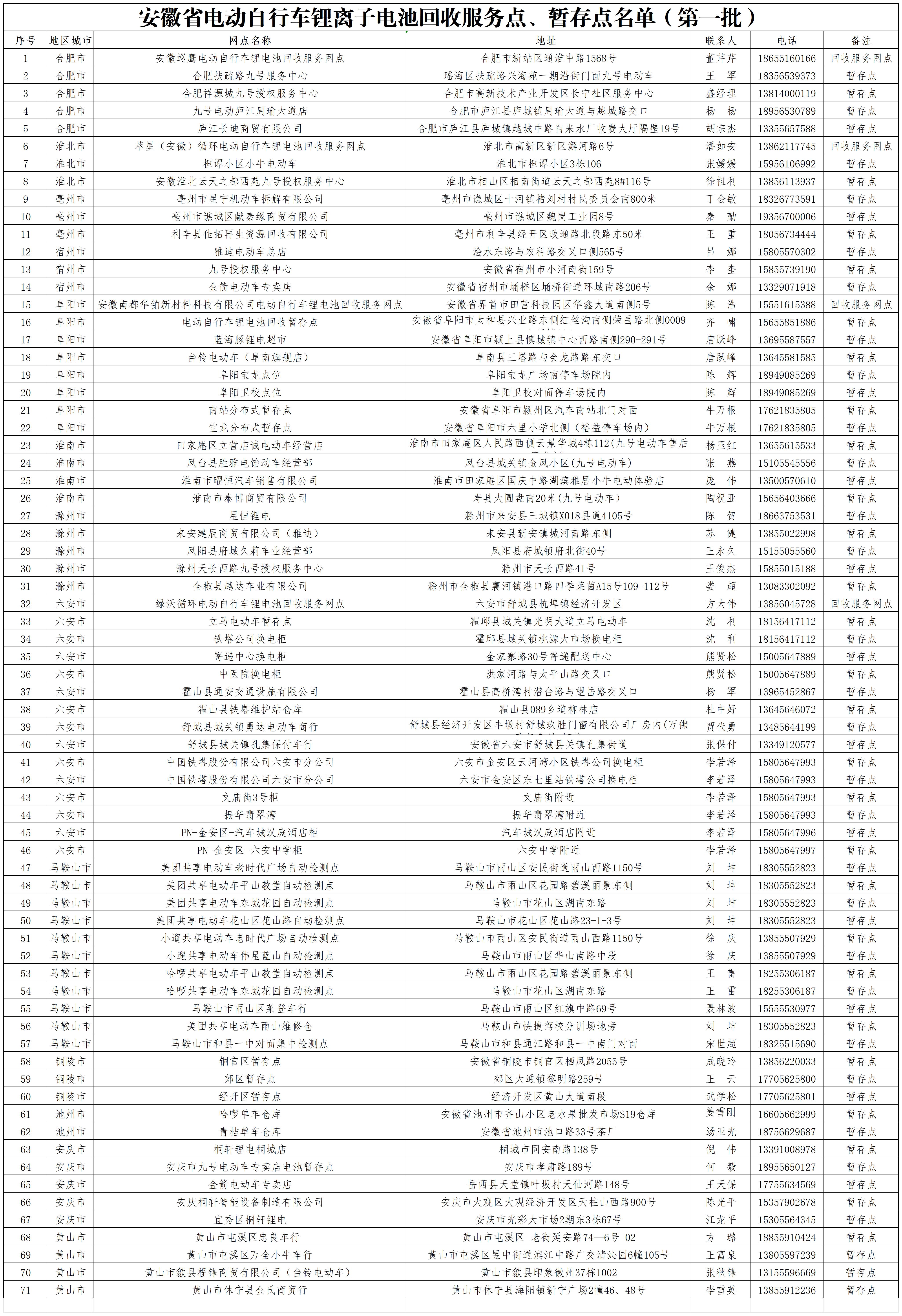 安徽省电动自行车锂离子电池回收服务点、暂存点名单(第一批)